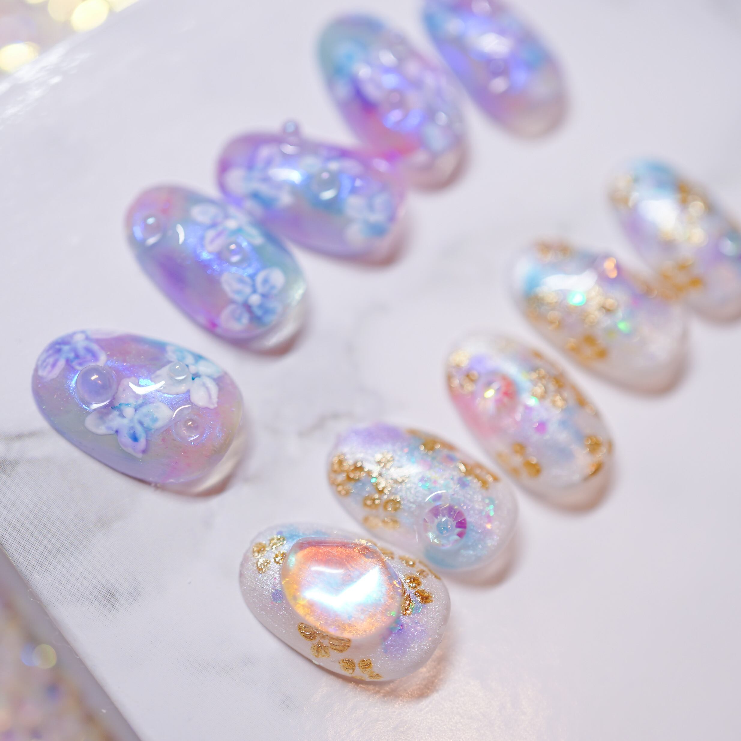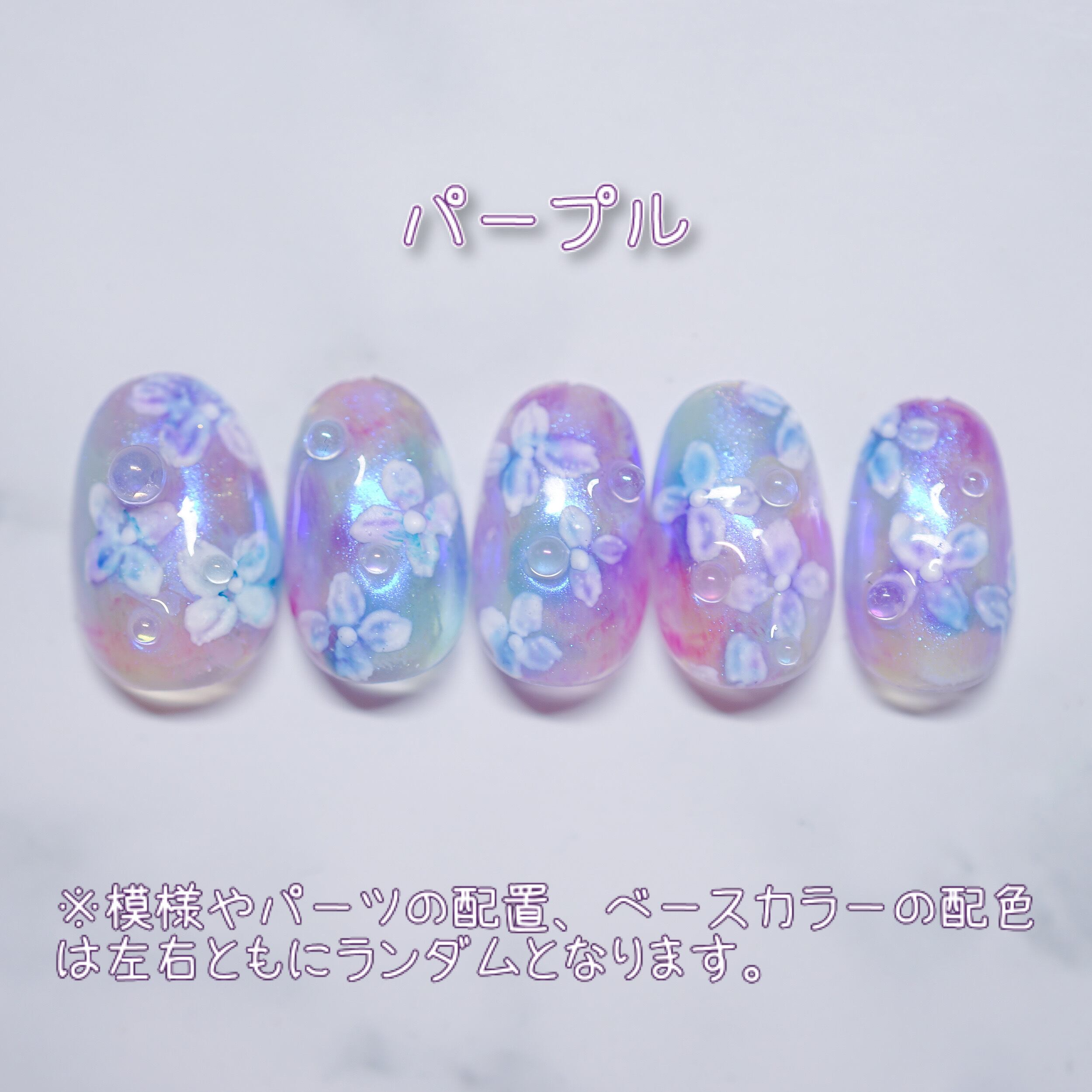 パープルは紫陽花をイメージしたカラーにキラキラのミラーパウダーをかけて上品でいて鮮やかな雰囲気に仕上げました。
